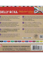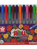 Sakura Gelly Roll pens feature a special water-based pigment gel ink that’ s archival quality, delivering bright, intense colours that won’ t fade. The unique gel ink technology ensures smooth writing results. Perfect for creative drawing, journaling, lettering, decorating and everyday writing, including legal documents - wherever permanence is important. Regular 12 piece fine set contains: · Black (21) · Blue (22) · Red (23) · Green (24) · Brown (25) · Violet (26) · Orange (27) · Royal Blue (28) · Pink (29) · Burgundy (33) · Yellow Green (34) · Yellow (48)