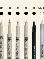 · This pack comes with 6 Pigma Micron black pens 005, 01, 05, 08, FB Brush Pen and 0.05 Gelly Roll